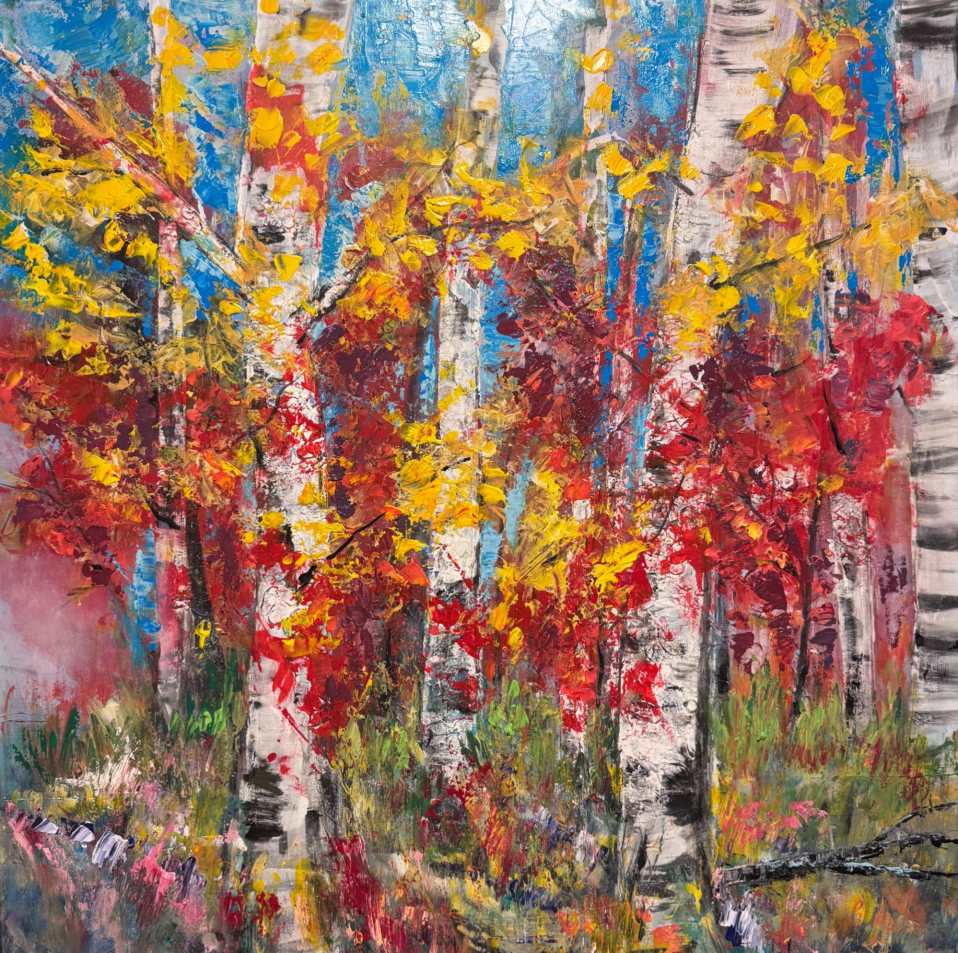 Na obraze dominují výrazné podzimní barvy, které okamžitě upoutají pozornost. Žluté listí břízek se mísí s ohnivými odstíny červených a oranžových javorů, zatímco zelené tóny dodávají kompozici svěžest a živost. Růžové akcenty pak přidávají jemnost a romantický nádech, který celý výjev zjemňuje a zklidňuje.