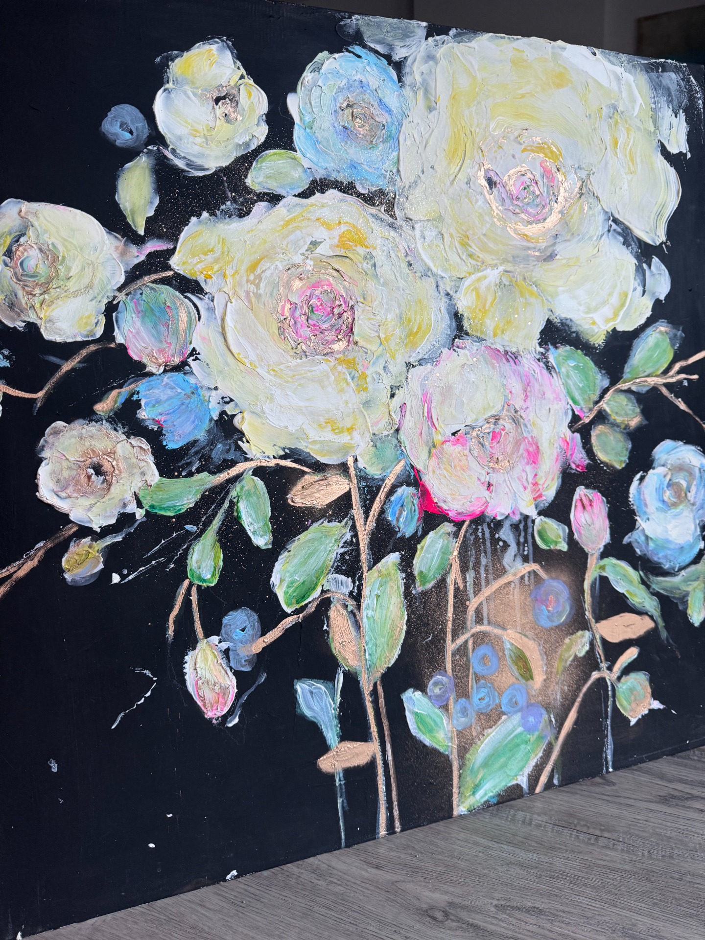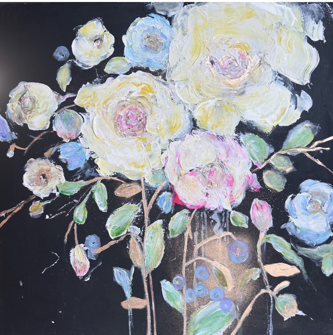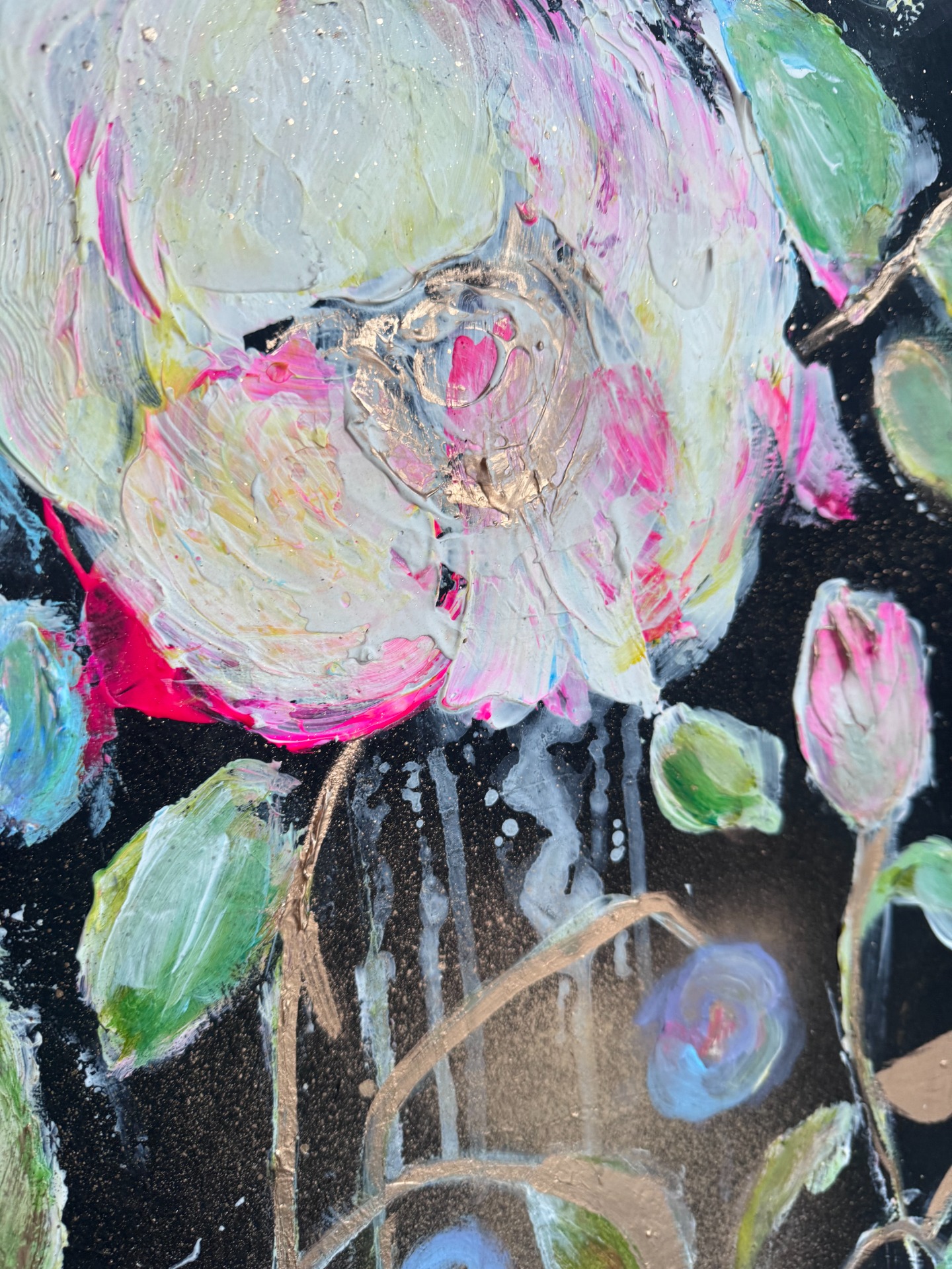 Plastická textura: Díky vrstvené strukturovací pastě vystupují květy z plátna do prostoru. Tato 3D struktura dodává malbě unikátní životnost a dynamiku, kterou plochý tisk nikdy nenahradí.