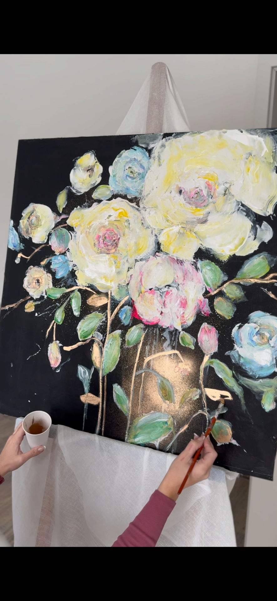 Hra světla a stínu: Sytě černé pozadí vytváří dokonalý kontrast k jemným, zářivým tónům květů. Díky použití zlaté barvy obraz mění svůj výraz podle toho, jak se v místnosti pohybuje světlo – zlaté detaily se v záři světla rozehrají a dodají interiéru nádech luxusu.